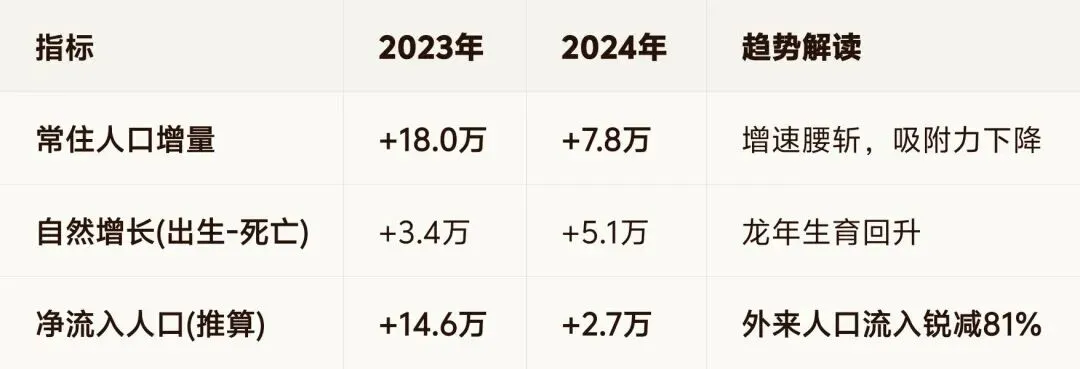 从表格中能看出来2023年当年被称为“北方人口增量第一城”,新增18万人中,81%(14.6万)靠外地人流入贡献。2024年新增总量降至7.8万,扣除龙年带来的自然增长(5.1万),实际净流入仅约2.7万。可见外部人口来郑州意愿大幅降低,增长主要靠“多生孩子”维持,城市吸引力面临压力。房价咋涨,咋稳赢。