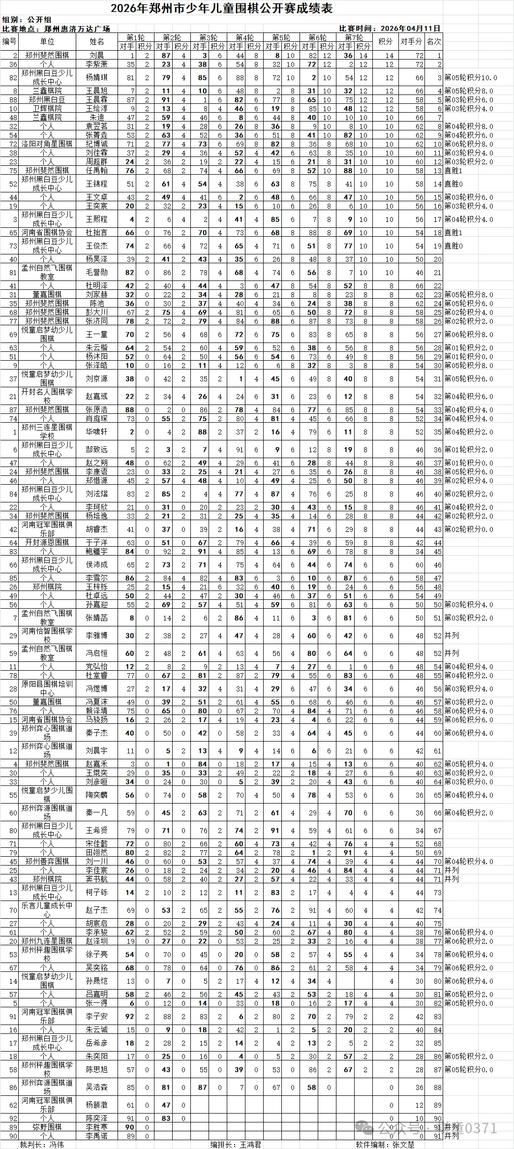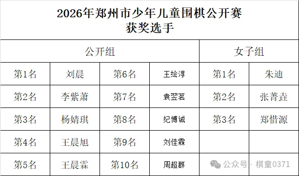 2026年郑州市少年儿童围棋公开赛于2026年4月12日在郑州市惠济区开元路68号万达广场(郑州惠济店)结束了全部赛程。本次比赛共报名92人,参赛棋手中业余6段2人,业余5段20人,业余4段37人,业余3段20人,业余2段3人,业余1段10人。名次表