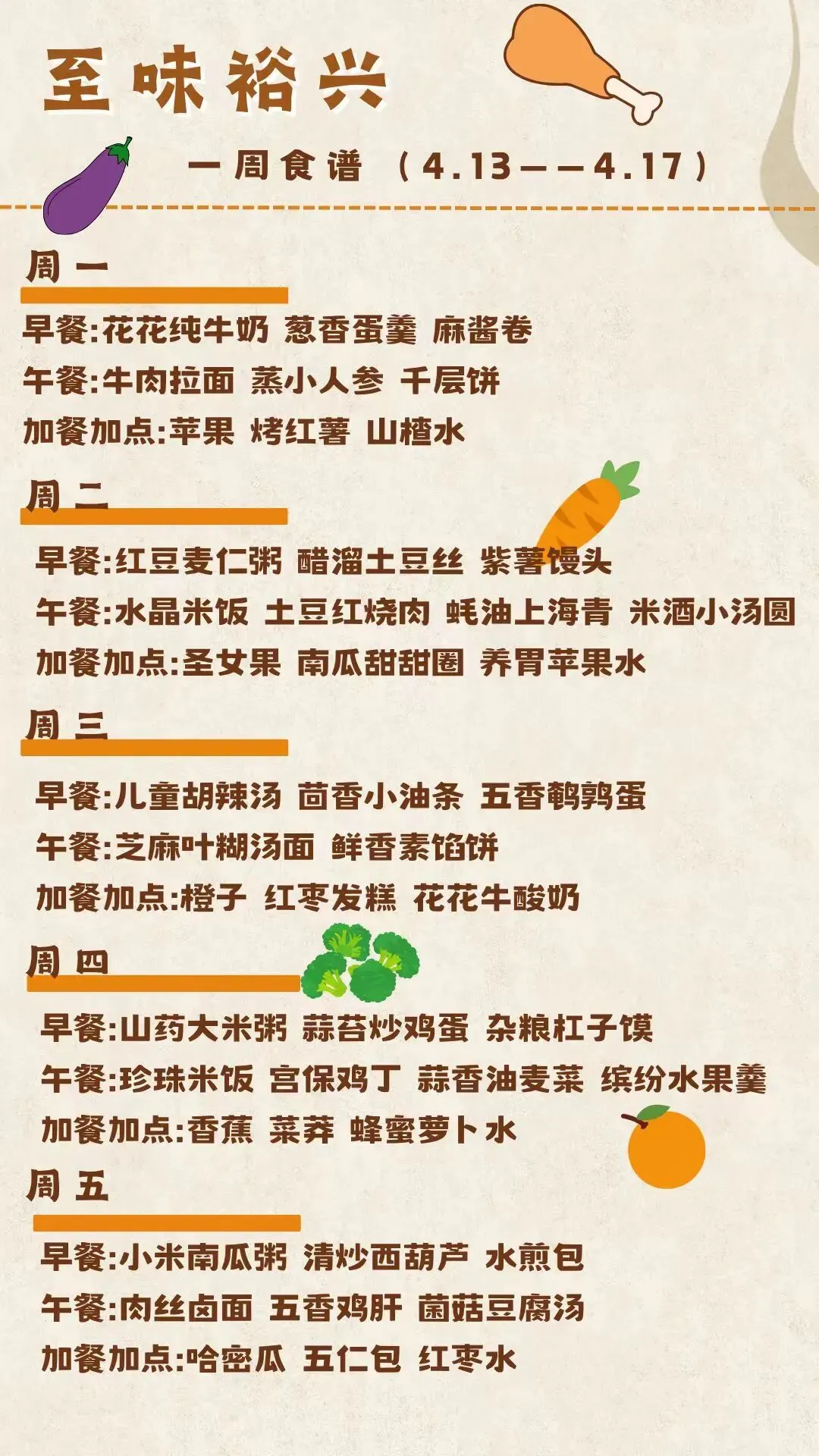 >【至味裕兴】“食”光美好,未来可期—郑州航空港区裕兴幼儿园第七周食谱(4.13—4.17)