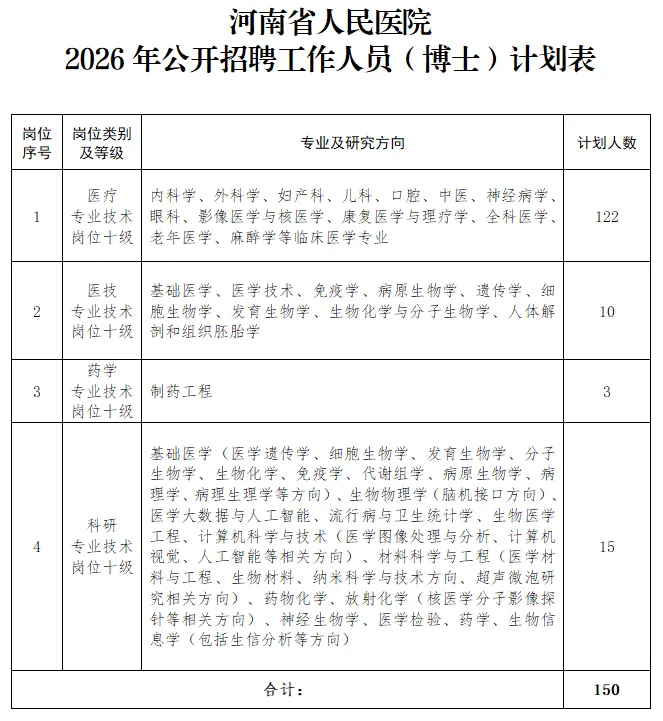 详见《河南省人民医院2026年公开招聘(博士)用人计划表》(附件1)。