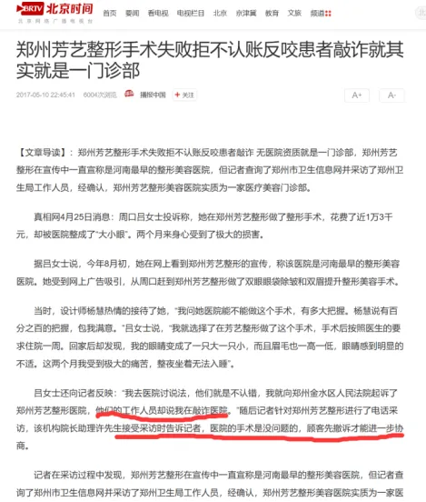 工工商登记实为郑州市金水区芳艺医疗美容门诊部,却长期对外宣传为“医院”,涉嫌虚假宣传。早早年曾两次被列入经营异常名录,被曝医师资质不明、使用非医疗美美容专用材料。202024年后更名为郑州市十七时芳艺医疗美容有限公司,企业状态正常常,无新增行政处罚,但早年失败案例与投诉记录仍可查。旧案新思:不管过多少年,这些医美红线不能碰
