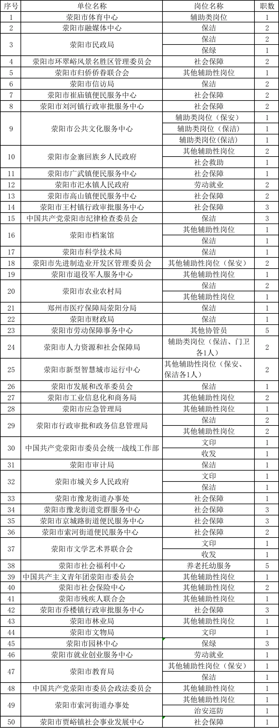 荥阳市公开招聘公益性岗位职位表