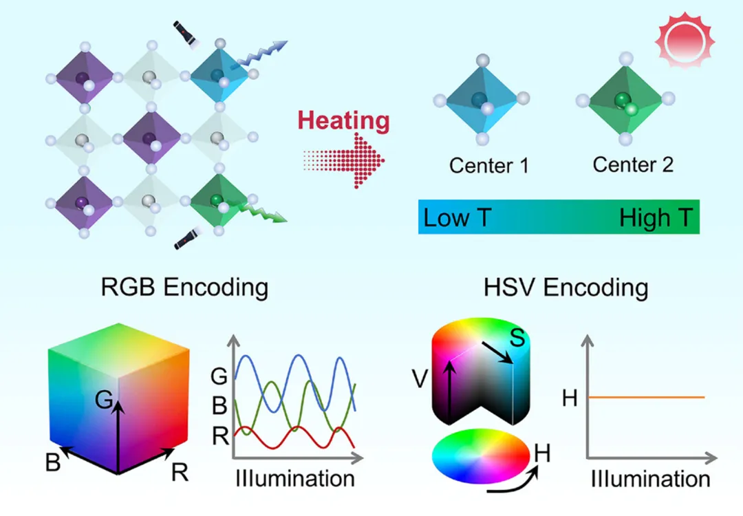 示意图1. 具有三维八面体结构的双钙钛矿卤化物中热致变色响应的示意图。