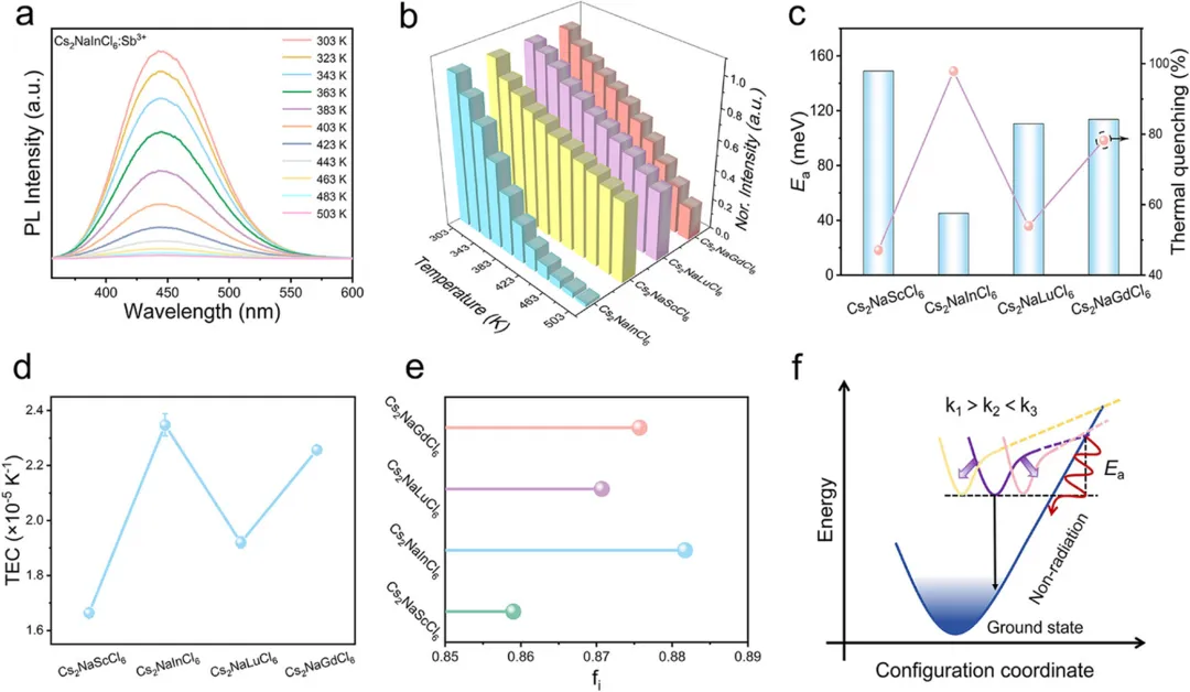 近年来,双钙钛矿卤化物作为有前景的基质材料引起了广泛关注,因其具有高缺陷容忍度、独特的八面体排列和本征低声子能量,为镧系离子的高效稳定占据提供了理想的晶体环境。此外,这些材料固有的软晶格和强电子 - 声子耦合促进了强烈的自陷激子(STE)发射的形成,这种发射对温度变化高度敏感,为下一代发光温度计的发展开辟了新途径。通过战略性地将宽带 STE 发射与镧系离子尖锐、明确的 f-f 跃迁耦合,可以设计出高灵敏度、多模态和多路复用的发光温度计。然而,一个关键挑战在于精确调控 STE 的光谱位置和热响应,这需要深入了解其热激活动力学以支持高性能、按需应用。