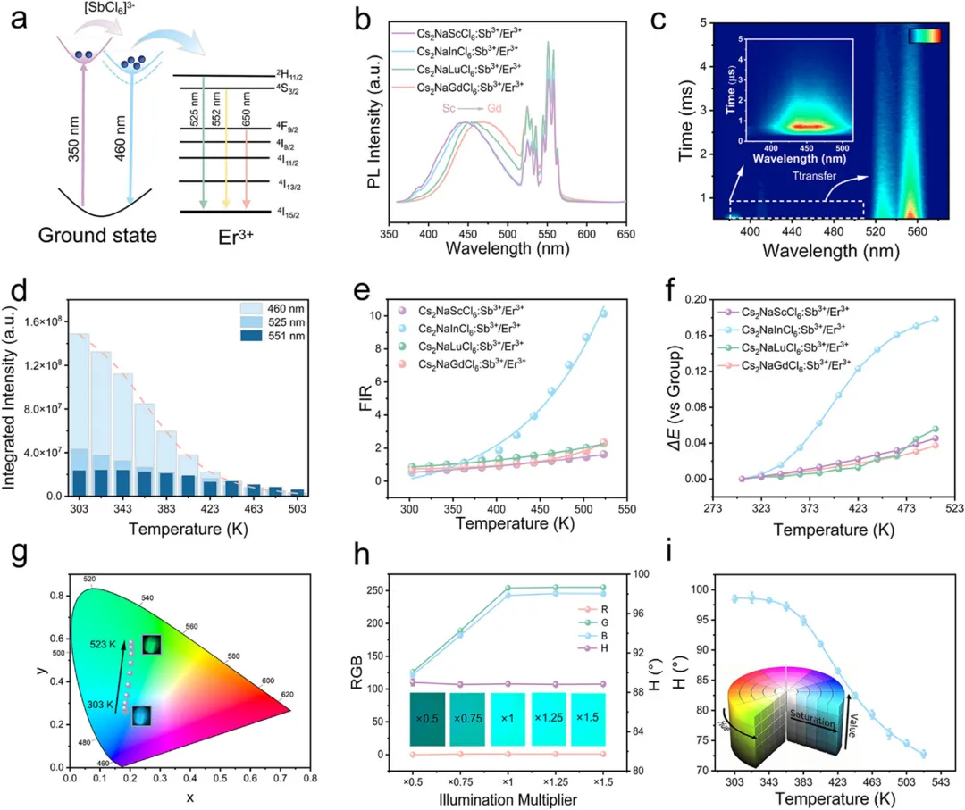 在这项研究中,郑州大学史志锋、陈旭、贾陌尘等阐明了 STE 的热辅助解陷机制,并介绍了一个基于阳离子工程化双钙钛矿的便携式智能比色热成像平台。调控三价阳离子位点可调节尺寸依赖的晶格硬度和键离子性,从而增强激子自陷过程中的晶格弛豫,导致 STE 发射的渐进红移和解陷热激活能垒的降低。值得注意的是,Cs₂NaInCl₆中强烈的四阶声子非谐性驱动了显著的晶格热膨胀和软化的键力常数,产生了无铅钙钛矿中报道的超低热激活能(45.08 meV)。尽管表现出最强的热猝灭,但它仍保持 85.27% 的高光致发光量子产率(PLQY)。通过利用 Er³⁺离子作为光谱稳定的发射器以诱导明显的热致变色行为,提出了一种基于色相 - 饱和度 - 明度(HSV)的比色测温方法,与传统的基于 RGB 的方法相比,能够更精确和稳健地量化固有色彩特性。为进一步减轻环境光波动和视角变化引起的伪影,集成了一种深度学习算法,能够直接从原始荧光图像中进行端到端的温度解码,准确率高达 92.20%。