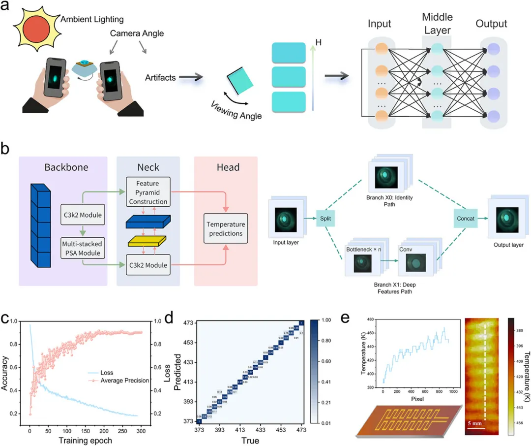 传统上,发光热成像依赖于预定义的校准曲线和简化的分析模型,将发光信号与温度关联起来。虽然在理想条件下有效,但这些方法在复杂环境中往往因校准漂移、动态干扰和信号交叉敏感性而不足,从而限制了准确性、适应性和可重复性。令人鼓舞的是,深度学习的进步可以通过从原始光谱或成像数据中自动学习稳健的特征表示来规避这些限制,从而在广泛条件下提供自适应、高保真的温度估计,标志着向完全自主和高通量热传感迈出了变革性的一步。原则上,基于卷积神经网络和目标检测模型的颜色识别技术可以直接从荧光图像的红 - 绿 - 蓝(RGB)通道中识别与温度相关的特征,从而消除了对笨重复杂光谱仪器的需求。尽管前景广阔,但深度学习驱动的发光测温技术在实现准确、实时和便携式热成像方面的实际应用仍未得到充分探索。