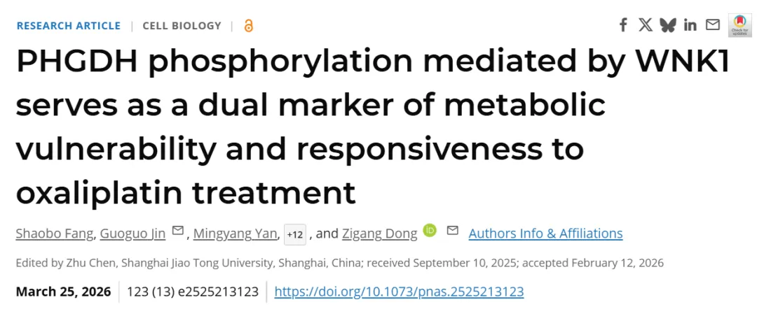 2026年3月25日,郑州大学董子钢、郭智萍、王梅云共同通讯在 PNAS(IF:9.1)在线发表题为“PHGDH phosphorylation mediated by WNK1 serves as a dual marker of metabolic vulnerability and responsiveness to oxaliplatin treatment”的研究,系统揭示了WNK1–PHGDH轴驱动的丝氨酸代谢重编程不仅促进肿瘤进展,同时赋予其化疗耐药能力。