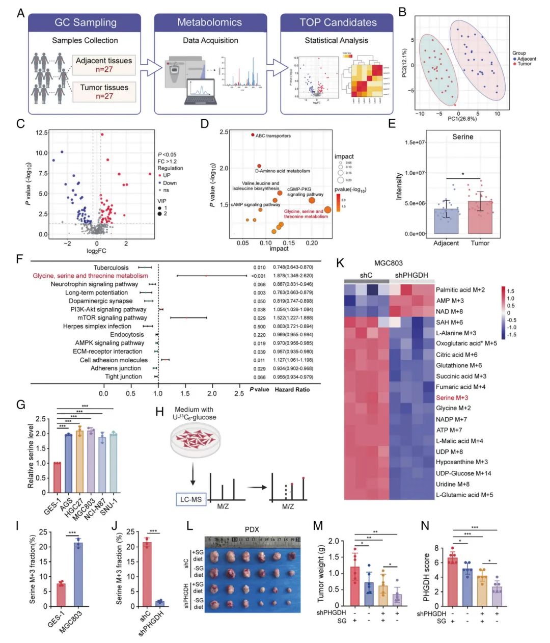 图1. 丝氨酸水平升高与 PHGDH 表达是癌症生长的必要条件。(A)人类胃癌组织及其配对邻近组织样本(n=27)的非靶向 UPLC -MS代谢组学分析流程图。(B)代谢组学数据的主成分分析。(C)人类胃癌组织相对于配对邻近正常组织的差异代谢物火山图(n=27样本,队列1)。(D)代谢物类别变化对通路的影响。(E)胃癌组织及其配对邻近正常组织中检测到的丝氨酸水平。(F) TCGA 数据库中胃癌患者(n=154)的单变量Cox回归分析显示与生存相关的通路。(G)人类胃黏膜上皮细胞(GES-1)及胃癌细胞(AGS、HGC27、MGC803、NCI-N87和SNU-1)中的丝氨酸水平。(H)细胞内U-[13C]-葡萄糖掺入丝氨酸的示意图。m/z,质荷比。(I)人类胃黏膜上皮细胞(GES-1)与胃癌细胞(MGC803)中丝氨酸13C掺入效应(n=4个生物学独立细胞样本)。(J) PHGDH 敲低(shPHGDH)与对照组(shC)相比对MGC803细胞中丝氨酸13C掺入(M+3)的影响(n=4个生物学独立细胞样本)。(K) PHGDH 敲低(shPHGDH)与对照组(shC)相比MGC803细胞中20种差异代谢物的热图(n=4个独立生物学细胞样本)。(L–N)肿瘤图像(L)、肿瘤重量(M)并基于 IHC 染色(N)呈现了 PHGDH 蛋白表达情况。