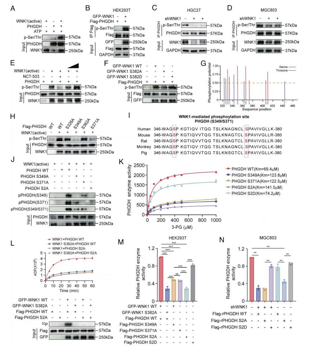 图2. WNK1通过磷酸化 PHGDH 蛋白的Ser349和Ser371位点来增强其酶活性。(A)采用泛磷酸化抗体进行蛋白质印迹分析,比较活性WNK1与失活 PHGDH 在体外激酶活性实验中的差异。(B)HEK293T细胞中共表达 GFP -WNK1与Flag- PHGDH 蛋白;Flag- PHGDH 经免疫沉淀后通过蛋白质印迹法(WB)分析磷酸化状态。(C和D)通过免疫沉淀(IP)和蛋白质印迹法分析WNK1敲低后HGC27和MGC803细胞中 PHGDH 磷酸化水平。(E)通过蛋白质印迹法分析WNK1诱导的 PHGDH 磷酸化呈剂量依赖性增加及NCT-503抑制作用。(F)采用具有激酶活性与失活突变体的WNK1进行体外激酶活性实验,并通过蛋白质印迹法验证。(G)运用NetPhos 3.0算法预测 PHGDH WNK1结合ASB结构域(残基323-455)中的磷酸化位点。(H)通过蛋白质印迹法分析WNK1与 PHGDH 突变体(S326A、S349A、S362A、S371A)的体外激酶活性实验。(I)不同物种间 PHGDH S349与S371氨基酸残基的序列比对。(J)使用磷酸化特异性抗体检测 PHGDH 野生型、单点突变体(S349A、S371A)及双突变体(S2A)与活性WNK1共孵育后的蛋白质印迹结果。(K)以3-PG为底物评估 PHGDH 野生型及突变体(S349A、S371A、S2A、S2D)的酶动力学特性。(L)在HEK293T细胞中进行[32P]-ATP标记实验,检测 PHGDH 野生型与S2A突变体与WNK1野生型或S382A突变体共表达时的ADP水平变化。(M和N)在WNK1过表达或敲低条件下,转染 PHGDH 野生型、S349A、S371A、S2A或S2D的HEK293T(M)与MGC803(N)细胞中进行 PHGDH 酶活性测定。