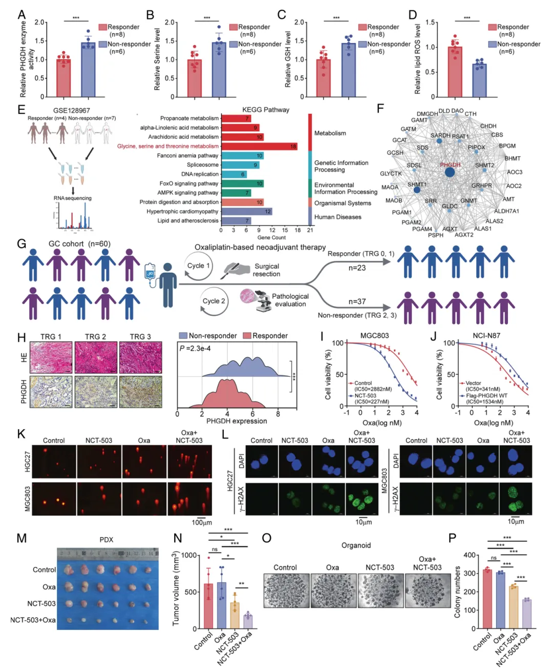 图3. PHGDH 表达与丝氨酸代谢与胃癌奥沙利铂耐药性相关性分析。(A–D) 通过酶活性测定或代谢物定量法检测奥沙利铂应答组(n=8)与无应答组(n=6)肿瘤组织中 PHGDH 酶活性相对水平(A)、细胞内丝氨酸(B)、 GSH (C)及脂质活性氧(D)的变化。(E) 基于GSE128967数据集(应答组n=4;无应答组n=7)进行应答组与无应答组差异基因表达的 KEGG 通路富集分析。(F) 以 PHGDH 为核心的蛋白质相互作用网络图(采用STRING数据库构建),显示甘氨酸、丝氨酸及苏氨酸代谢相关酶群。(G) 接受奥沙利铂新辅助化疗临床队列示意图(n=60例样本,队列2)。病理评估将患者分为应答组(TRG 0-1,n=23)与无应答组(TRG 2-3,n=37)。(H) 不同 TRG 评分患者肿瘤样本的H&E染色与 PHGDH IHC 染色代表性结果,及应答组与无应答组 PHGDH 表达分布对比。(I-J) MGC803(I)与NCI-N87(J)细胞经奥沙利铂处理72小时后的剂量-效应曲线,分别显示 PHGDH 抑制剂(NCT-503)与 PHGDH 过表达条件下的实验结果。细胞活力通过 MTT 法进行评估。(K) 显示经奥沙利铂、NCT-503或其联合治疗后HGC27和MGC803细胞DNA损伤加剧的彗星实验结果。(L) 经奥沙利铂、NCT-503或其联合处理细胞中 γ -H2AX(绿色)与 DAPI(蓝色)的免疫荧光染色结果。(M) 各治疗组切除 PDX 肿瘤的代表性图像。(N) 各组肿瘤体积定量分析(每组n=6只小鼠)。(O) 不同处理条件下类器官培养的代表性图像。各组别分别展示对照组、奥沙利铂组(Oxa)、NCT-503组及奥沙利铂+NCT-503联合组的类器官形态学特征。(P) 类器官培养物中集落数量的定量分析。