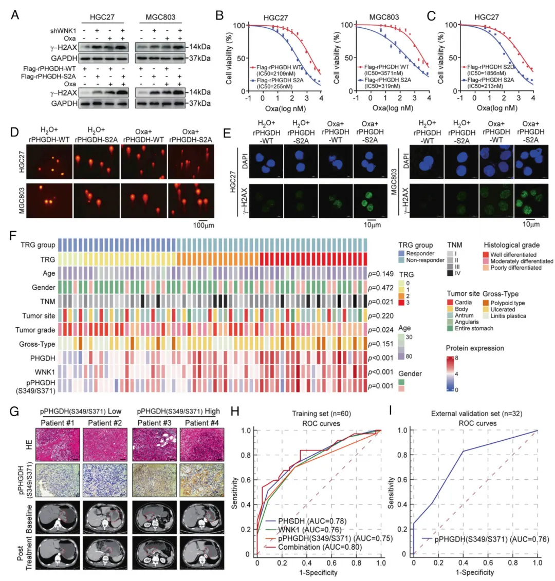 图4. Ser349/Ser371位点 PHGDH 磷酸化调控DNA损伤反应及奥沙利铂敏感性,可作为胃癌潜在预测生物标志物。(A) 指定条件下HGC27与MGC803细胞中 γ -H2AX水平的蛋白质印迹分析。(上)shWNK1细胞经奥沙利铂处理。(下)用rPHGDH-WT或磷酸化缺陷突变体rPHGDH-S2A重建的 PHGDH 敲除细胞。(B和C) 表达rPHGDH-WT或rPHGDH-S2A的HGC27与MGC803(B)细胞经奥沙利铂处理72小时后的剂量-反应曲线。细胞活力通过 MTT 法测定。(D) 显示过氧化氢或奥沙利铂(Oxa)处理后,用rPHGDH-WT或rPHGDH-S2A重建的HGC27与MGC803细胞中DNA损伤的彗星实验。(E) (D)组处理细胞中 γ -H2AX焦点(绿色)的免疫荧光检测;细胞核用 DAPI(蓝色)复染。(F) 热图显示按肿瘤消退分级(TRG 组)分层患者的临床、病理及蛋白表达特征。 PHGDH 、WNK1及pPHGDH(S349/S371)表达水平采用颜色编码。(G) 低 PHGDH 磷酸化水平与高 PHGDH 磷酸化水平患者pPHGDH(S349/S371)的代表性H&E染色、 IHC 染色及治疗前后CT图像对比。(H) ROC曲线显示训练集(n=60)中 PHGDH 、WNK1及pPHGDH(S349/S371)对奥沙利铂反应的预测价值。(I) ROC曲线显示外部验证集(n=32)中pPHGDH(S349/S371)对奥沙利铂反应的预测价值。