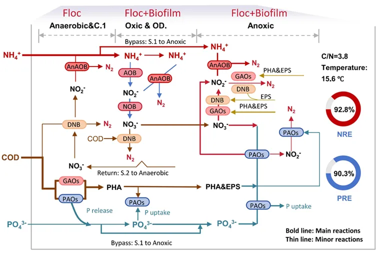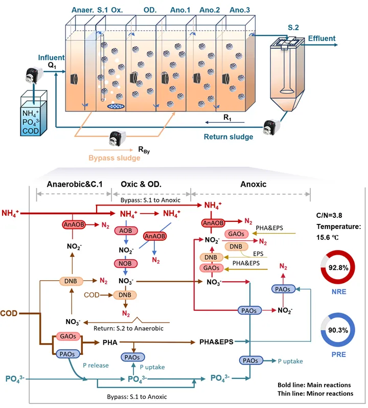 近日,郑州大学吉建涛教授课题组在Water Research上发表了题为“Enhancing carbon allocation and utilization via a sludge-bypass anaerobic/oxic/anoxic process for ultra-efficient nutrient removal from municipal wastewater under low C/N and temperature conditions”的研究论文(DOI:10.1016/j.watres.2026.125901)。该研究针对传统生物处理工艺在低碳氮比(C/N)、低温条件下碳源不足、氮磷协同去除效率低的难题,创新性地提出了新型污泥超越泥膜混合厌氧/好氧/缺氧(AOA)工艺。通过增设中沉过渡池,该工艺成功将富含内碳源(PHAs)的污泥从厌氧区超越至缺氧区,有效避免了PHAs在好氧区的无效消耗,从而显著提升了后续同步脱氮除磷的效率。经过320天的连续运行,该污泥超越AOA系统在15.6 ℃,C/N为3.8条件下,实现了92.8%的平均总氮(TIN)和90.3%的总磷(TP)去除率,为低碳、低温地区污水处理厂的高效稳定运行提供了新的技术路径。针对低C/N比、低温下市政污水处理中碳源不足导致协同脱氮除磷效率较低的瓶颈问题,本研究开发了一种新型“污泥超越”泥膜混合AOA工艺。该工艺通过在厌氧区后设置中沉过渡池,将富含PHAs的污泥直接“超越”至缺氧区,巧妙地规避了传统工艺中内碳源在好氧区被无效氧化的关键缺陷。320天的长期运行结果表明,该工艺在C/N=3.8、15.6 ℃的严苛条件下,实现了稳定高效的营养物去除性能。研究结合批次试验、物料衡算和微生物群落分析等手段,系统揭示了工艺通过优化碳源分配、调控微生物生态位(促进PAOs富集)以及强化内源短程反硝化、厌氧氨氧化、反硝化除磷等途径协同实现超高效脱氮除磷的机理。该研究为现有污水处理厂的升级改造提供了极具潜力的节能降碳解决方案。传统污水处理工艺中,好氧区会不可避免地驱动内碳源(如PHA)代谢氧化,导致其被“无效消耗”。这使得有限的碳源无法有效留存至后续的缺氧区,从而严重制约了系统在低C/N和低温条件下同步脱氮除磷性能。针对上述瓶颈,本研究开发了新型“污泥超越”AOA工艺。其关键设计是在厌氧区与好氧区之间增设中沉过渡池,将富含PHAs的污泥直接“超越”至缺氧区,从而有效保护内碳源免受好氧氧化。本研究证明,该设计确保了碳源在缺氧区的充足供应,强化了内源短程反硝化、厌氧氨氧化、反硝化除磷等多途径协同作用,最终在C/N仅3.8、温度低至15.6 ℃的严苛条件下,实现了92.8%和90.3%的氮和磷平均去除率。污泥超越AOA反应器营养物质去除性能
