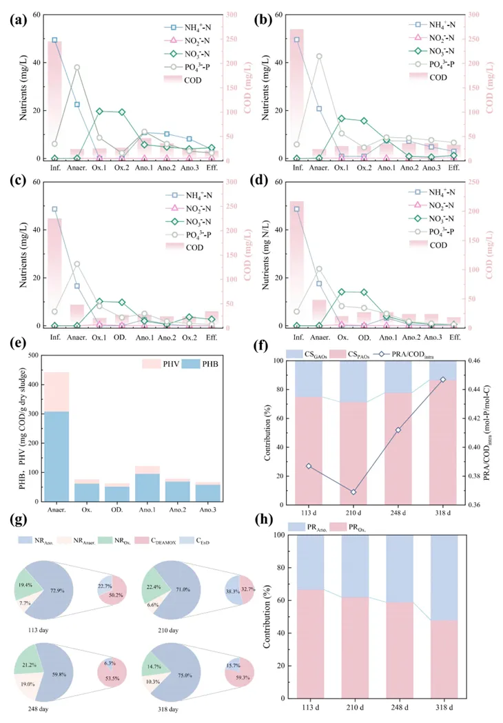 Fig. 2. Variations of nutrients along the sludge-bypass AOAreactor on day 113 (a), 210 (b), 248 (c), 318 (d); Variations of intracellular carbon sources on day 320 (e); Contributions of PAOs (CSPAOs) and GAOs (CSGAOs) to the intracellular carbon storage in the anaerobic zone, the ratio of PRA to CODintra (f); Contribution ratios of TIN removal in each functional zone, as well as the contributions of DEAMOX and EnD to TIN removal within the anoxic zone (g); Contribution ratios of phosphorus removal in oxic zone (PROx.) and anoxic zone (PRAno.) (h).