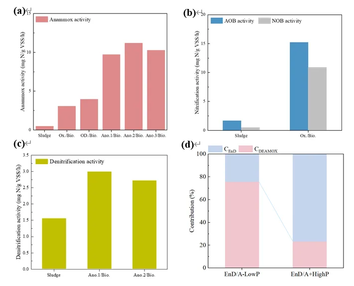 Fig. 3.Anammox activity (a), nitrification activity (b), denitrification activity (c); the endogenous denitrification performance of floc sludge under different anoxic influent PO43--P level (d). CEnD and CDEAMOXwere the corresponding contributions of DEAMOX and EnD to TIN removal.