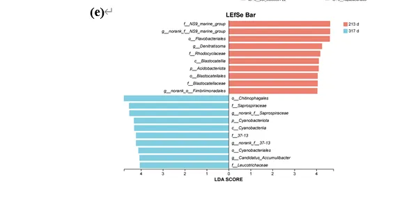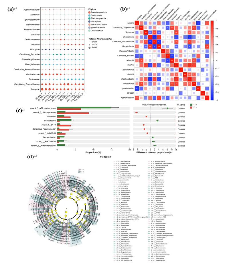 Fig. 5.Microbial community variation along the sludge-bypass AOA reactor on days of 213 and 317 (a); The relationship of core microbial in sludge-bypass AOA reactor by Pearson correlation analysis (b); The strength of correlation was defined by a color code with blue indicating negative correlations, white a neutral context, and red a positive correlation. Microbial composition differences in the sludge-bypass AOA system between 213 and 317 days (c); Cladogram showing the phylogenetic distribution of the bacterial lineages of before and after the reconstruction of the sludge-bypass AOA reactor (d); Indicator bacteria with LDA scores of 4 or greater in bacterial communities of the sludge-bypass AOA reactor (e).微生物群落分析揭示了核心菌群从Denitratisoma向Candidatus Accumulibacter的显著演替。Candidatus Accumulibacter的相对丰度由0.5%显著增加至2.6%,而Denitratisoma则从4.0%降至0.6%。中间沉淀池和污泥超越策略优先将有限的COD分配给PAOs,同时限制了传统DNBs的底物可得性,从而在长期运行中维持了PAOs的优势地位,实现了高效的协同脱氮除磷性能。网络共现分析