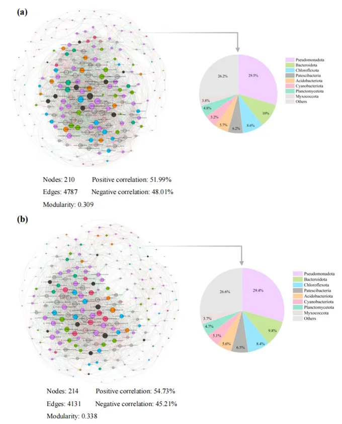 Fig. 6. Layout and taxonomic profiles of sludge-bypass AOA reactor microbial co-occurrence network on day 213 (a) and day 317 (b).通过共现网络分析发现,污泥超越泥膜混合AOA系统稳定后,微生物群落间的正相关性从52.0%增长至54.7%,表明微生物种间互养代谢增强;模块度从0.309增至0.338,表明微生物类群形成了更专业化的功能模块,代谢分工更为明确。此外,各功能区的Ace、Chao和Shannon指数均升高,表明微生物群落多样性和结构复杂性增加。结果表明,污泥超越AOA系统营造了有利的功能微生物生境,从而促进了低温、碳限制条件下系统稳定高效协同脱氮除磷效果。机理和意义