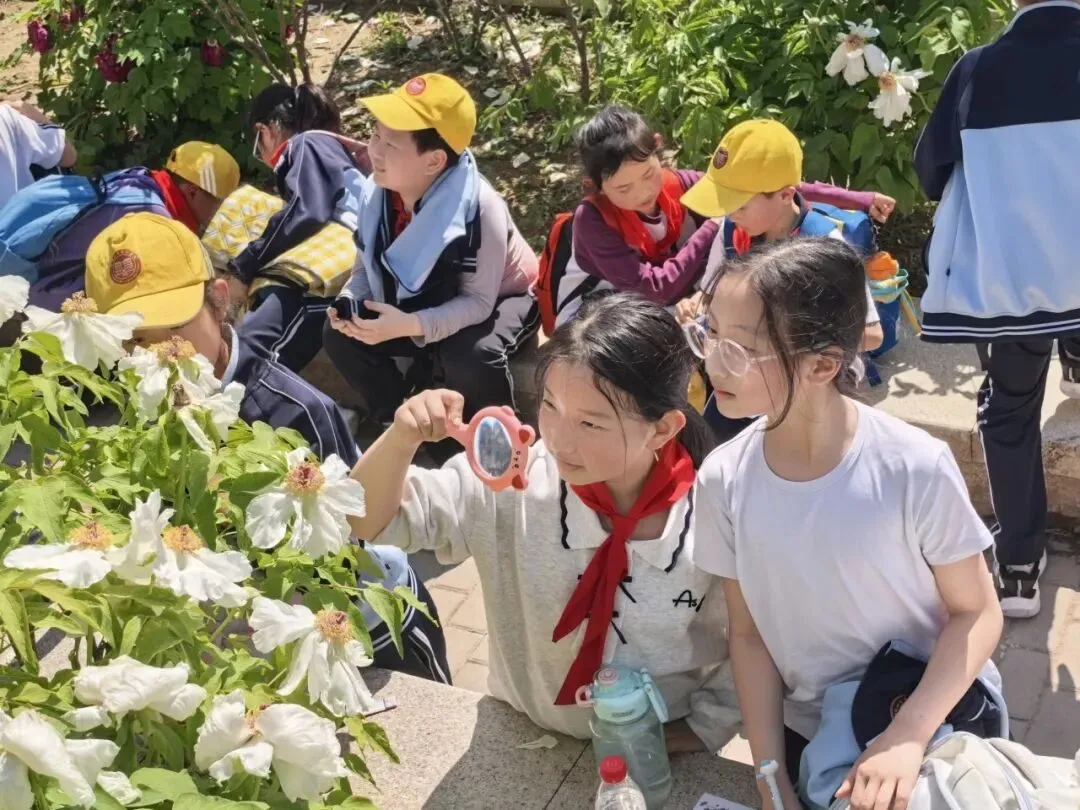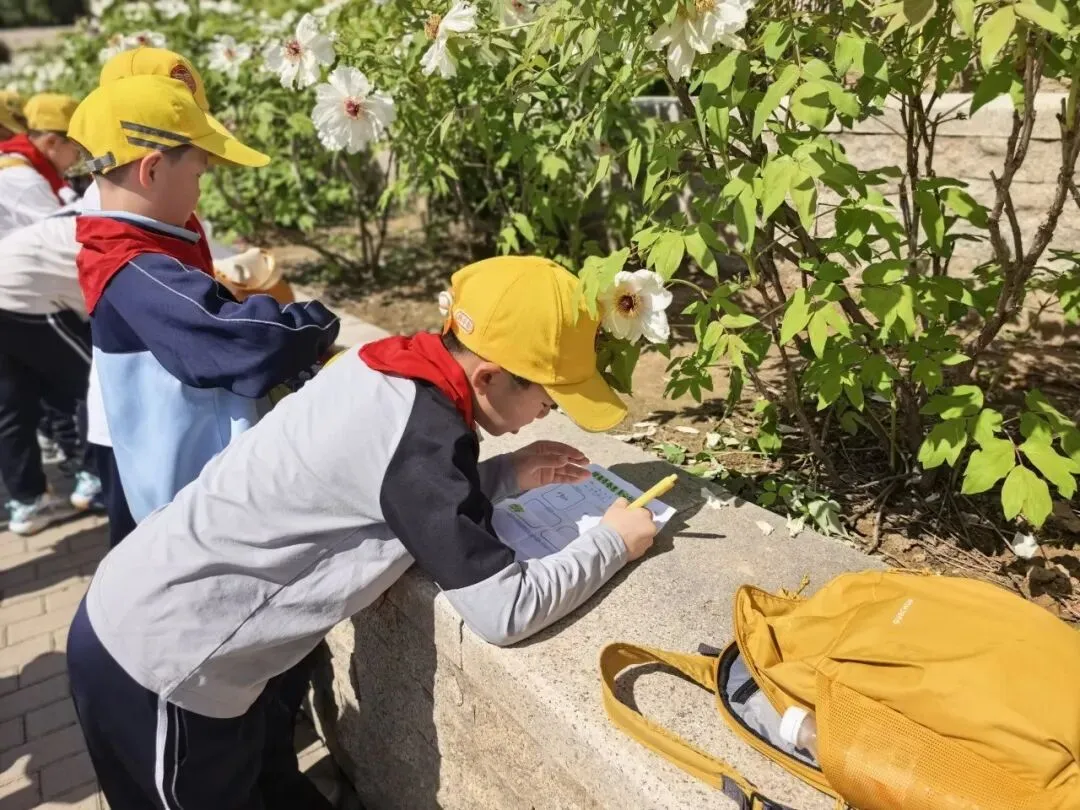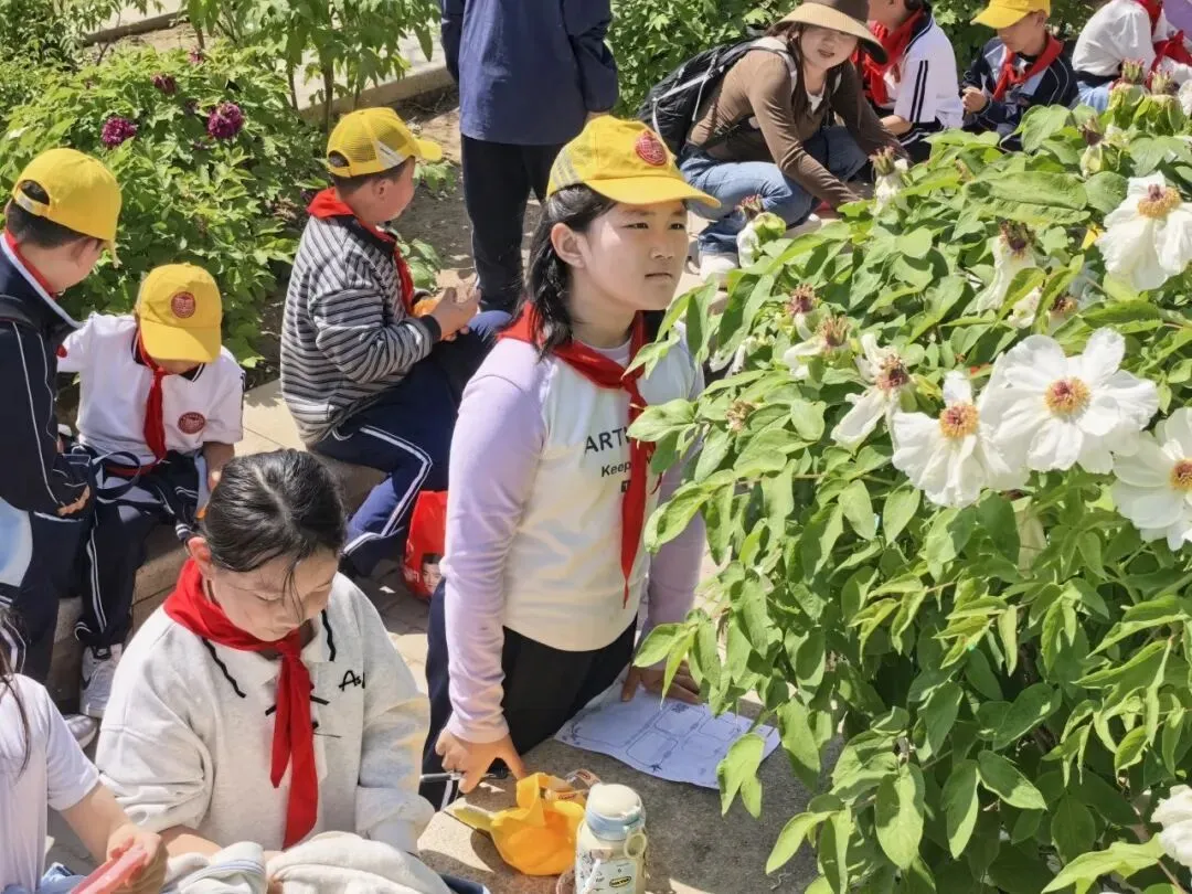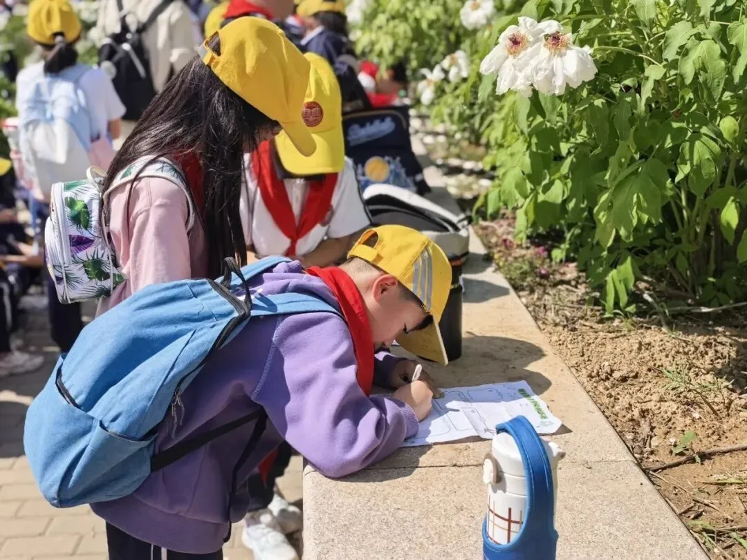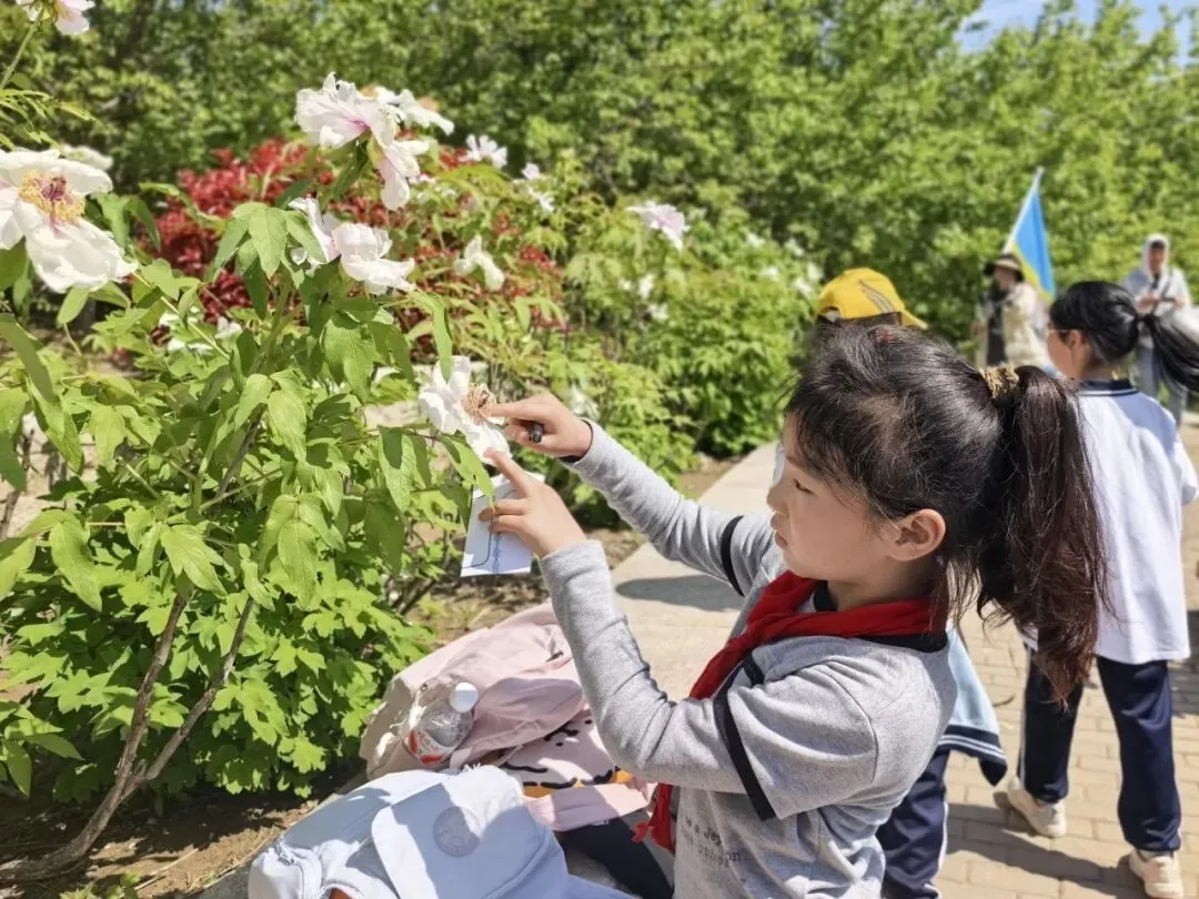 牡丹园里,繁花似锦。孩子们分组在老师引导下俯身观察,从含苞花苞到舒展花冠,从粉紫淡雅到红玫艳丽,细致记录花形、花色与纹理。大家边观察边交流,将春日繁花之美化作鲜活写作素材,在自然中感受美好、积累知识。