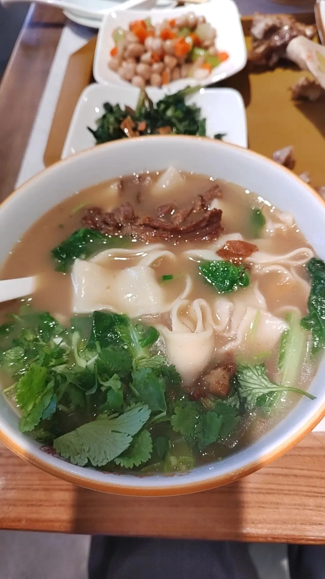 面条是现抻的,筋道,细腻,滑溜,羊骨熬制的奶白浓汤,鲜嫩的羊肉片,配菜丰富新鲜,还有其它自制的烧鸡卤猪蹄等,味道都很棒!