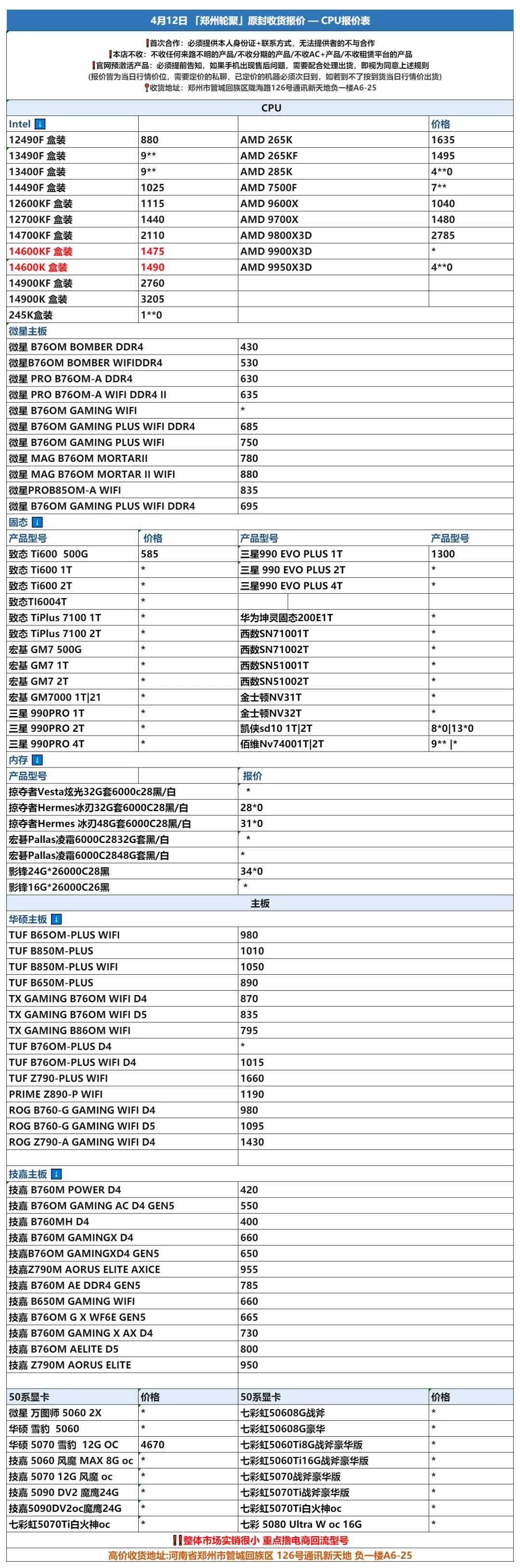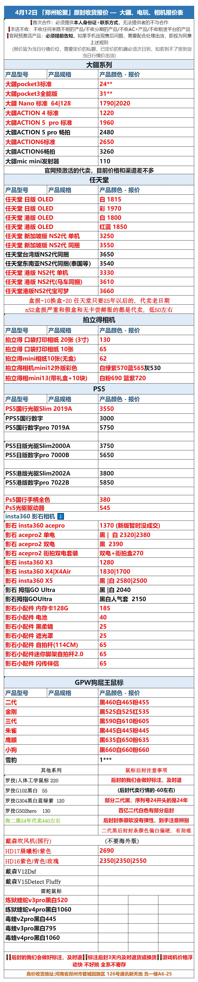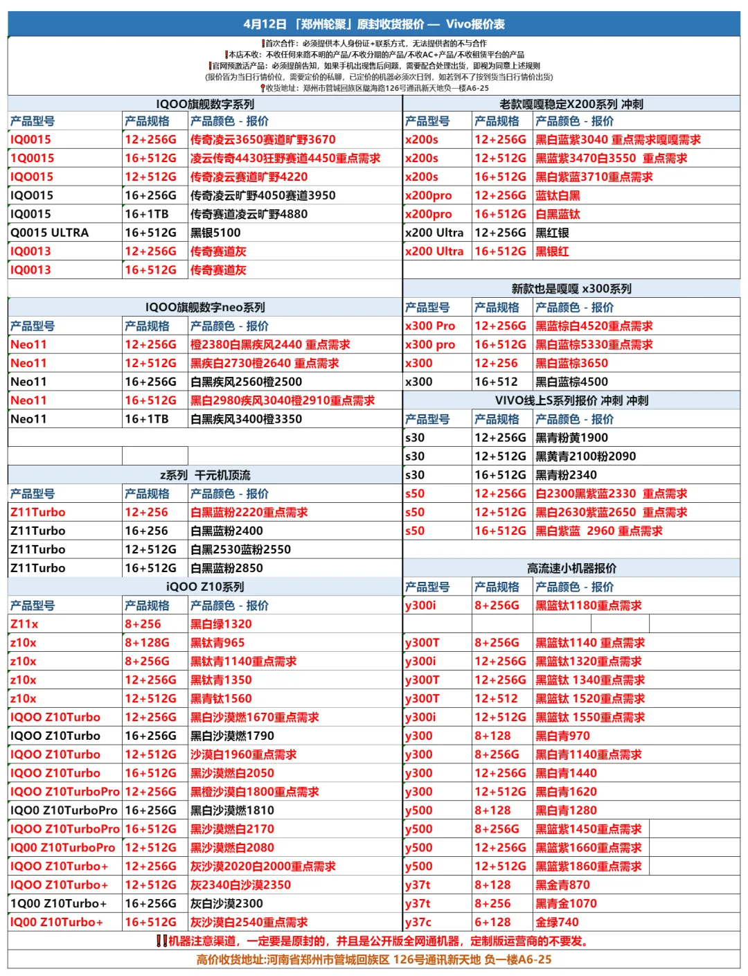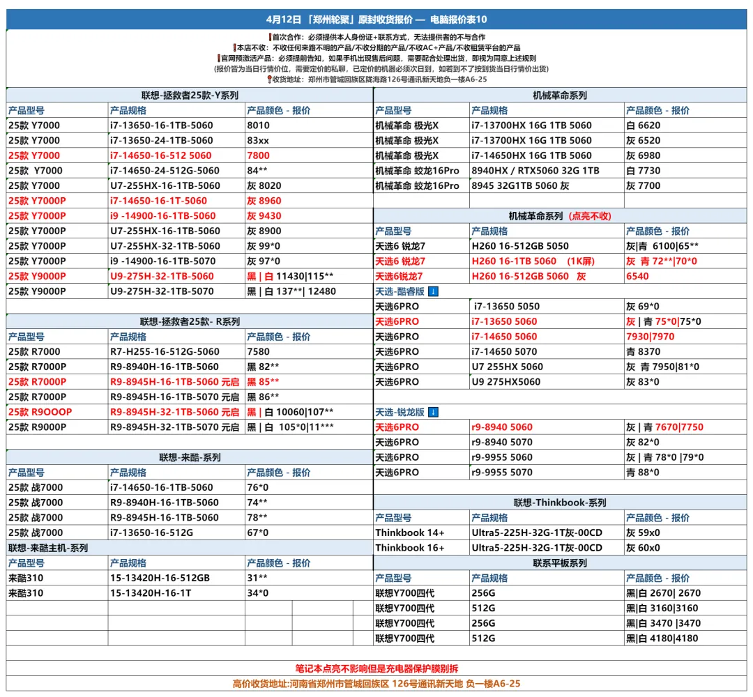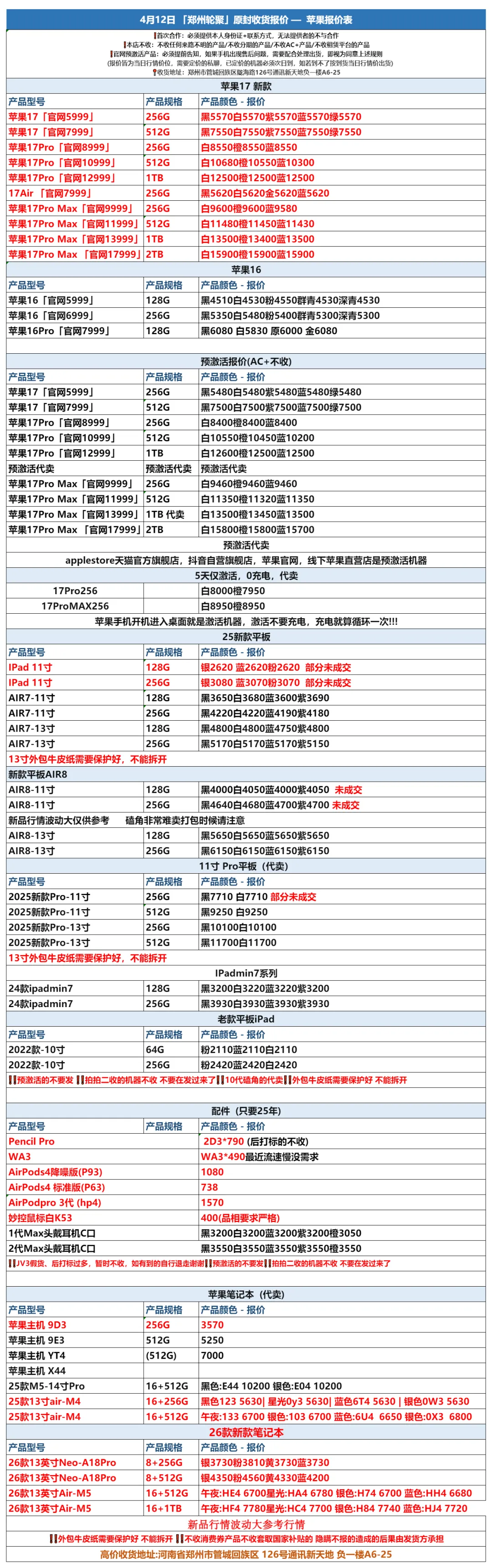 郑州通讯新天地轮聚通讯 2026年4.12日数码报价更新