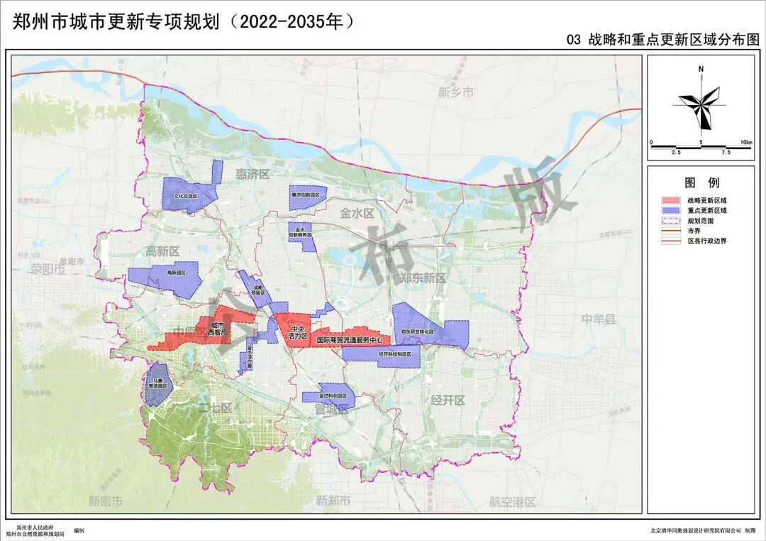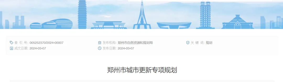 2024年3月7日,郑州市自然资源和规划局发布《郑州市城市更新专项规划》(2023-2035年)。| 规划范围:为郑州市主城区(即惠济区、金水区、管城回族区、二七区、中原区、郑东新区、经济技术开发区、高新技术产业开发区)所辖区域内的现状建设用地。规划期限:为 2023—2035年,近期到2025年,远期到2035年。 |