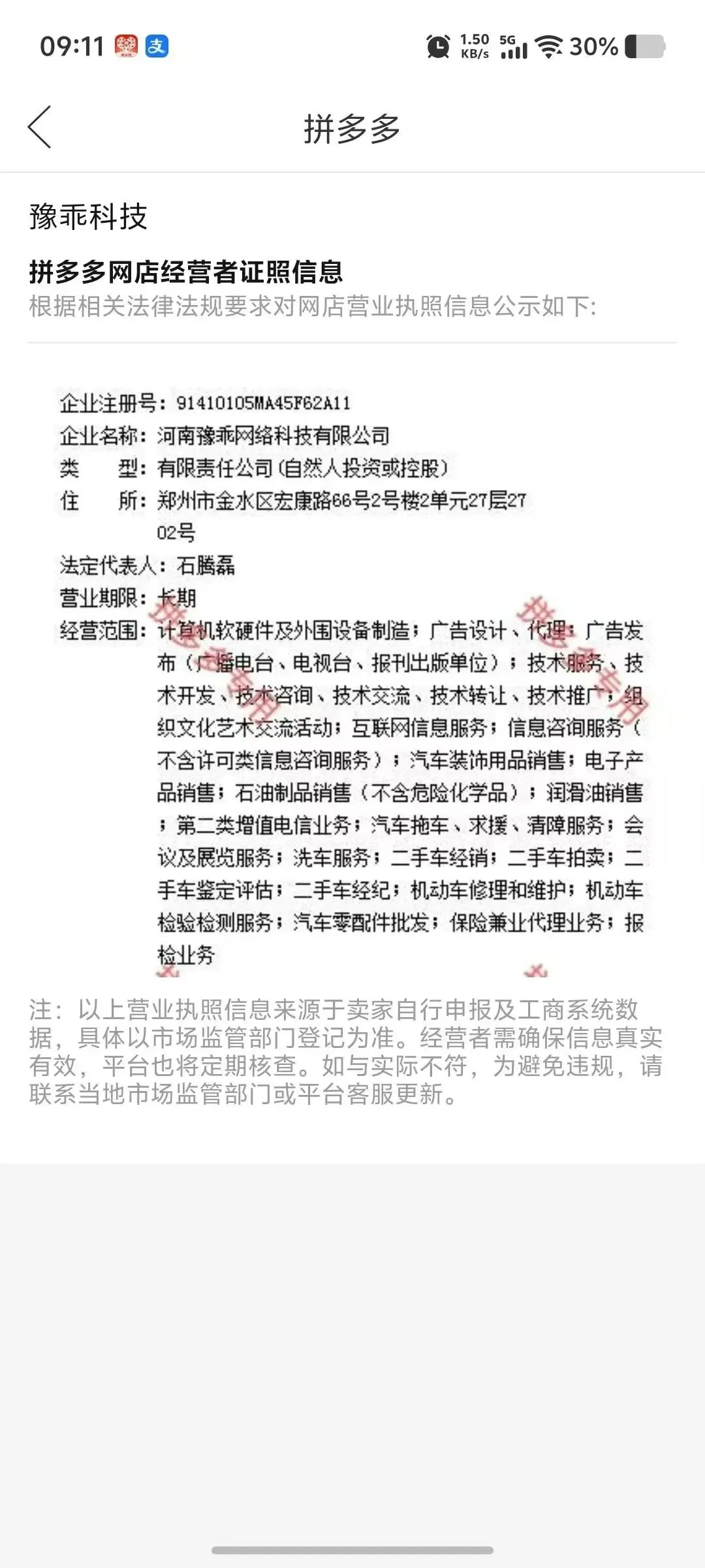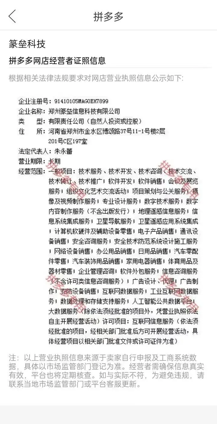 我们根据商家在拼多多官方平台【上海寻梦信息技术有限公司】公布的营业执照获悉:该店铺在拼多多店铺是 篆垒科技,名称营业执照是【郑州篆垒信息科技有限公司】,企业注册号:91410105MAG0EH7899 住所:河南省郑州市金水区博颂路37号11-1号楼2层 201号C区197室 法定代表人:朱永蕾