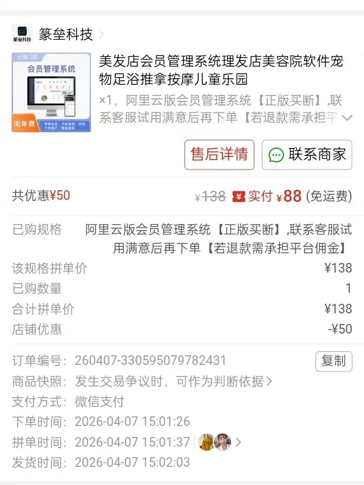 📅事件时间线:本人于**2026年4月7日15:01分26秒在拼多多平台名为「科技店铺」的商家处下单购买一款软件产品,订单编号是: 260407-330595079782431 正常软件都包含U盘与加密狗,从和卖家对话和卖家宣传获悉商家宣传承诺可购买之后软件永久使用后期无任何费用,本人付款后等待商家发货并正常安装使用。