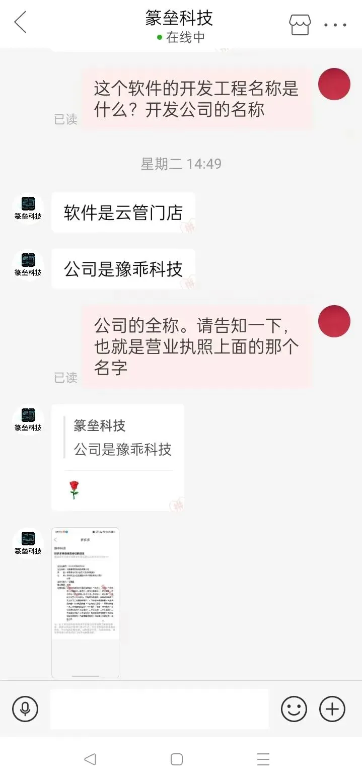 根据卖家和买家对话,卖家告知【卖家拼多多平台店铺【篆垒科技】提供软件的软件开发商营业执照公布内容显示:企业注册号:91410105MA45F62A11企业名称:河南豫乖网络科技有限公司 类型:有限责任公司(自然人投资或控股)住所:郑州市金水区宏康路66号2号楼2单元27层27 法定代表人:石腾磊