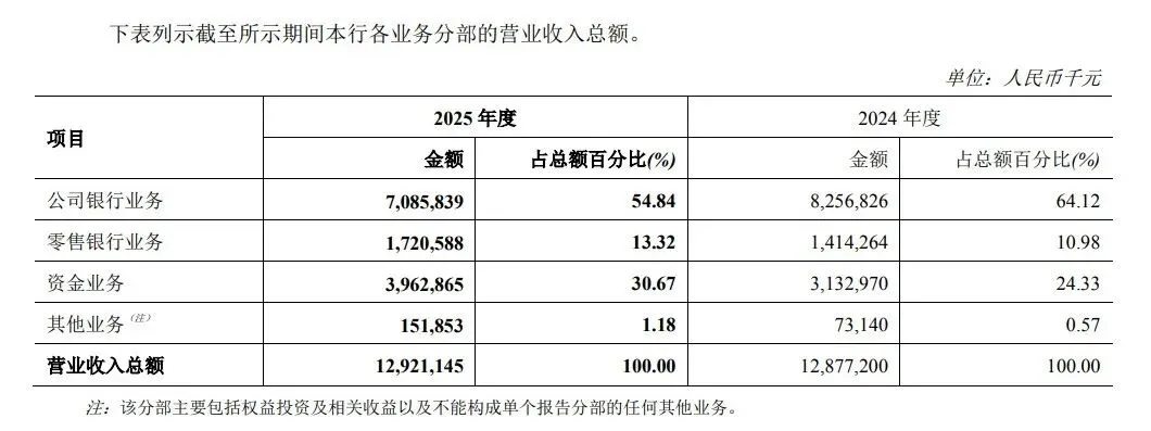 放眼2025年,郑州银行支柱业务——公司银行业务收入70.86亿元,同比下滑14%;其营收占比也从2024年的64.12%下降近10个百分点至54.84%。