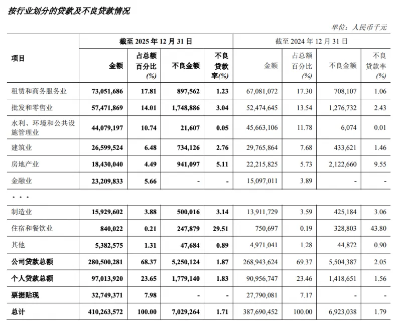 如下图所示,除房地产业务外,占据该行“公司贷款”最多的租赁和商务服务、批发和零售、水利环保、建筑以及制造业5大门类,其不良金额与不良率均有一定幅度的提升。
