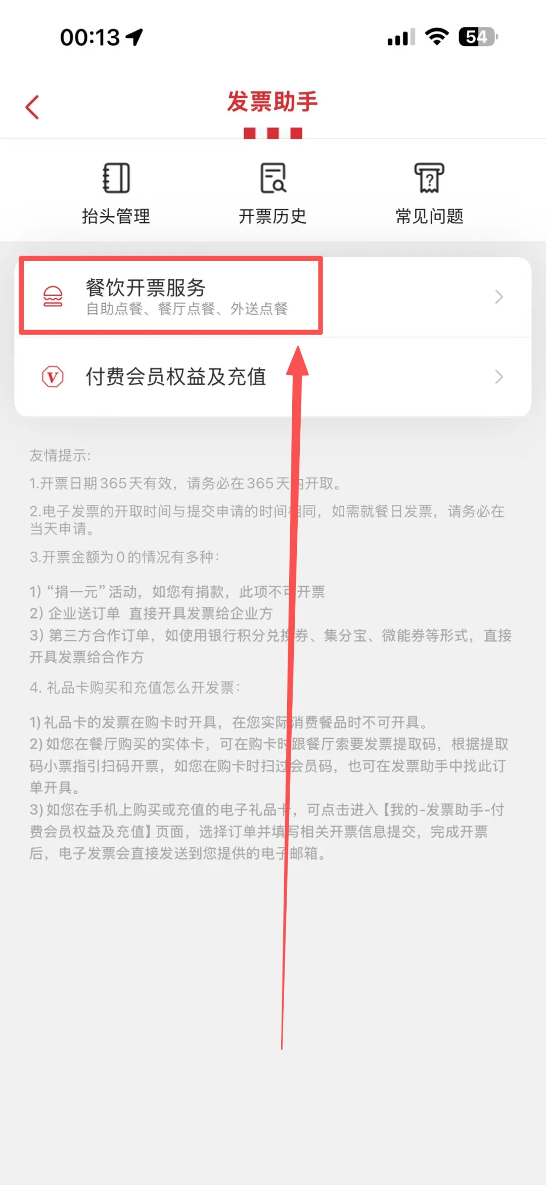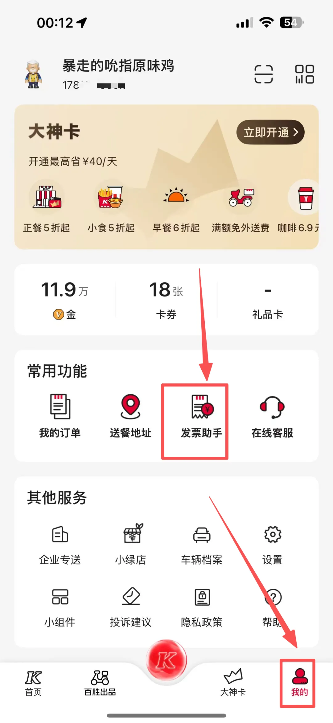 在肯德基小程序或app中选择【我的】,点击发票助手,选择【餐饮开票服务】,选择足够订单后可开票用于发票抽奖(支持合开)