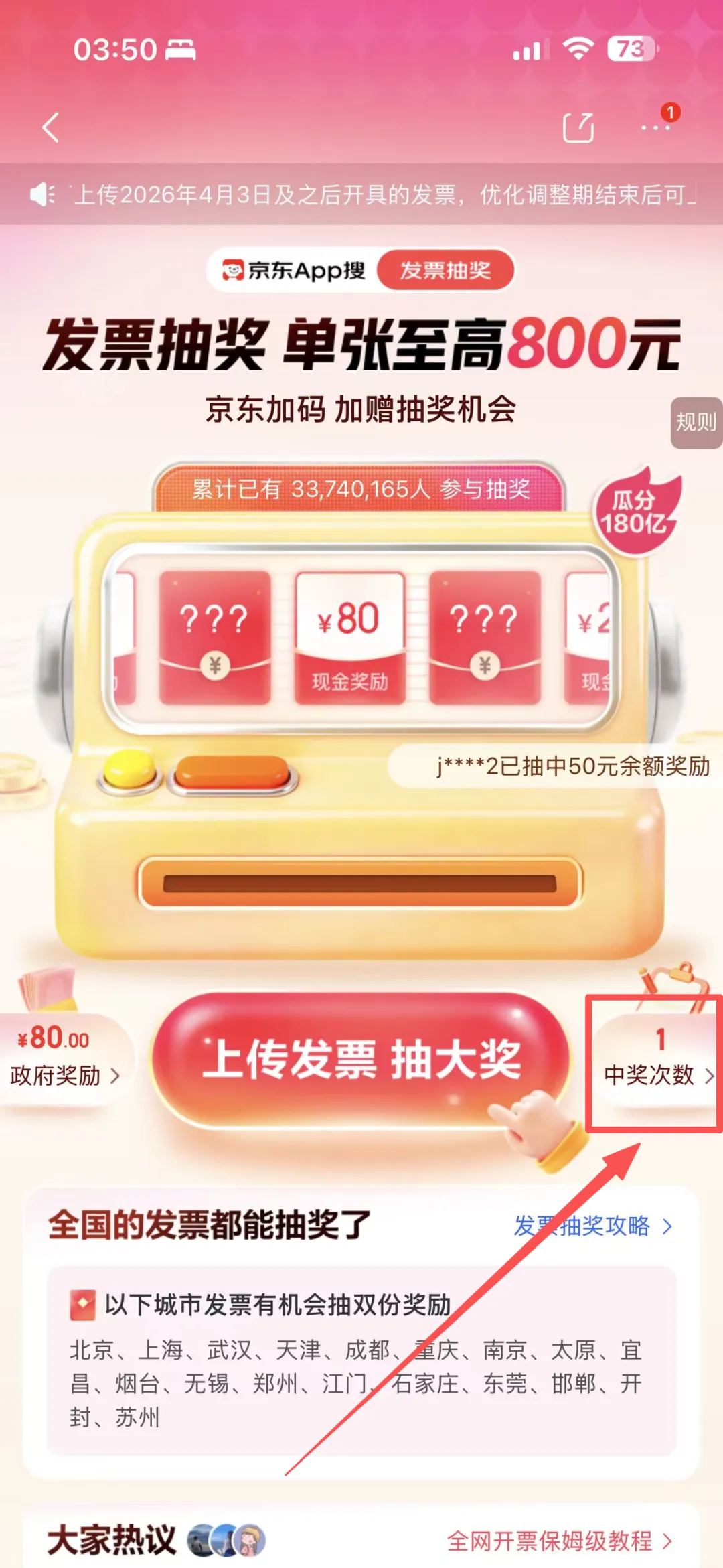 在发票抽奖界面点击右下角【中奖次数】,进入后可看到中奖情况,点击即可立即将中奖金额提现