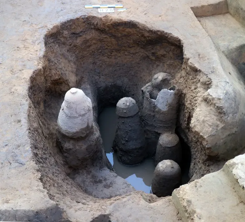 由河南省文物考古研究院、北京大学考古文博学院发掘的登封王城岗遗址位于嵩山南麓河南省登封市告成镇,2025年发掘面积800平方米,获王湾三期文化阶段(夏代早期)、二里头文化阶段(夏代中晚期)和商代早期多项突破性成果。不仅完善了对夏代早期都邑规划布局的认知,还将中原青铜礼器源头推至夏代早期。祭祀坑出土蛋壳黑皮陶爵形器,衔接龙山与二里头陶爵序列,为研究夏代核心酒礼器与中原礼制起源提供关键材料。遗址出土了商代早期出土金箔片、鼓风嘴、玉戚、卜骨、原始瓷等,遗址在商代时依然繁荣。本次发掘为中原早期王朝城市规划、水利、冶金、礼制起源及夏商社会结构的研究提供重要实证。