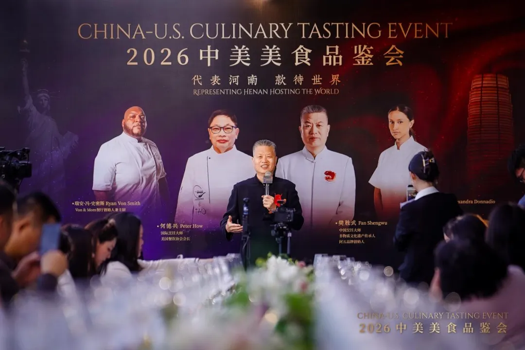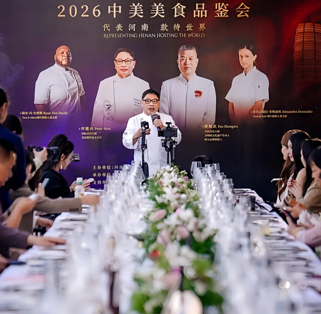 近日,在中国郑州北龙湖金融岛,以“代表河南 款待世界”为主题的2026中美美食品鉴会开幕式在中和豫宴举行。来自中美两国餐饮行业的名厨大师、知名企业家、艺术家、食客代表齐聚一堂,共同见证这场跨越太平洋的美食文化盛宴。