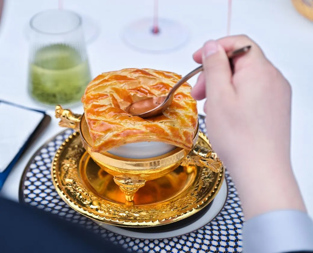 开幕式现场,一道道匠心独运的菜品化身为流动的艺术品,将豫菜千年的传承底蕴与走向世界的创新愿景娓娓道来。酥皮蛤蜊胡辣浓汤将太平洋蛤蜊浓汤与中原胡辣汤奇妙结合——以辛香胡辣汤为魂,融入黄油与海参、鲍鱼等海味,搭配中式葱油饼,胡辣开胃,既有中原的浓郁,又有海洋的鲜美。