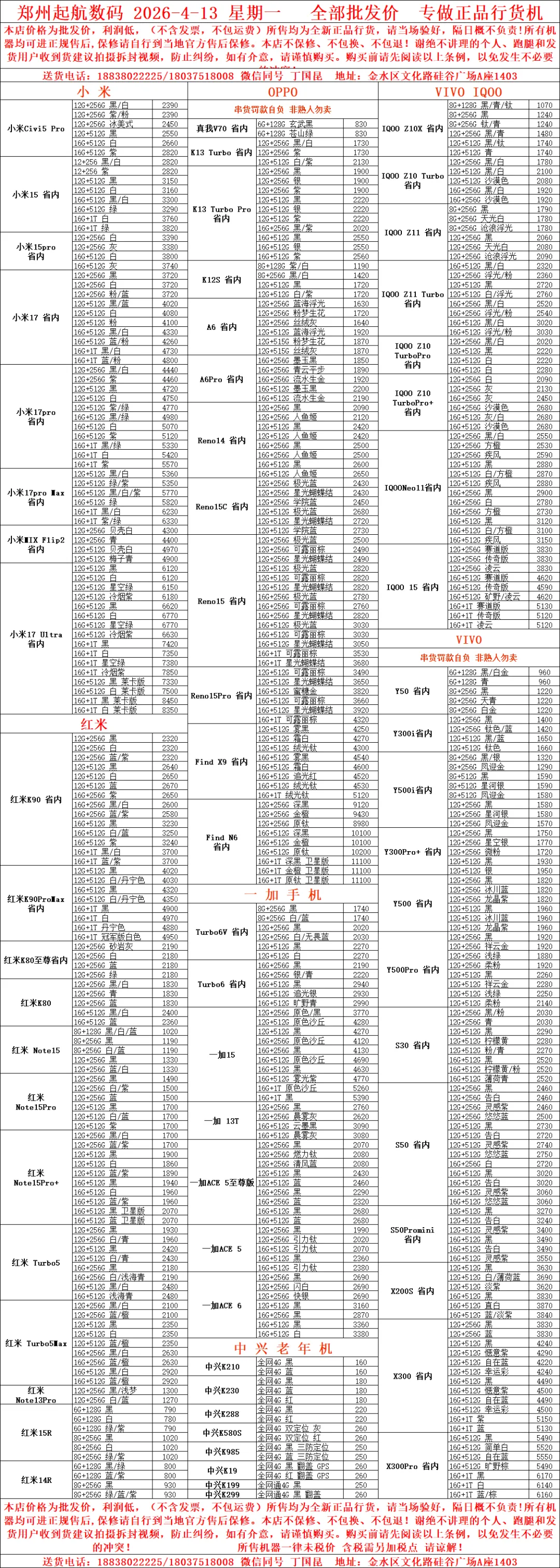 每天手机最新行情 请关注微信每日推送微信公众号:郑州起航数码公司地址:郑州市金水区文化路82号硅谷广场A座1403