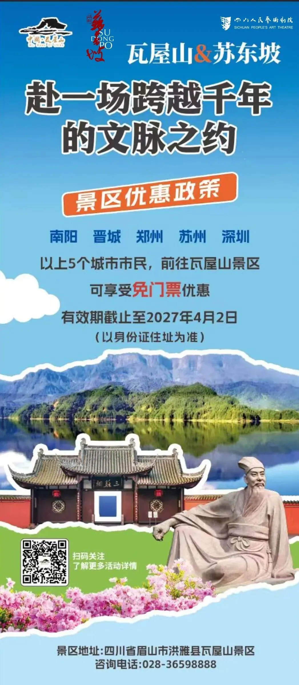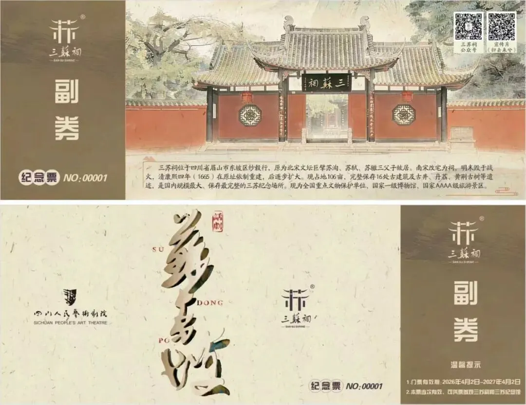 即日起至2026年4月18日,凭虎丘山景区门票(含电子票)至尹山湖大剧院票务中心,可享话剧《苏东坡》任意价位演出票五折优惠(早鸟、V+折扣不叠加,惠民票不参与活动)。