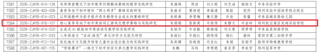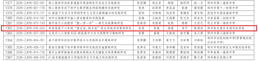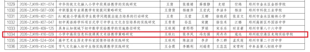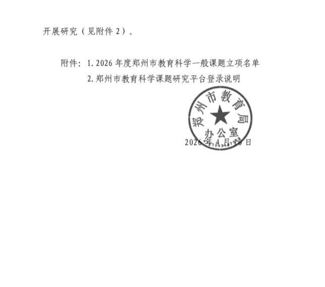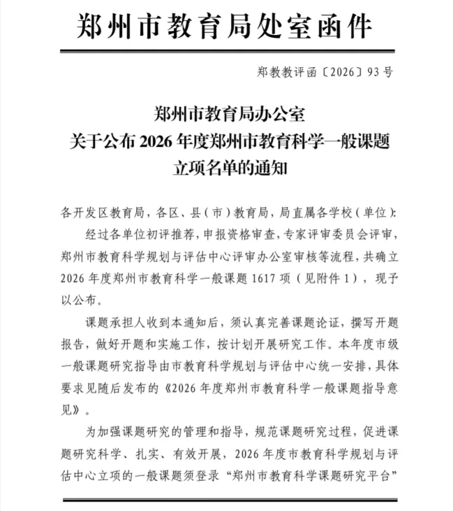 近日,郑州市教育局办公室正式公布《2026年度郑州市教育科学一般课题立项名单的通知》,我校共有三项课题成功获批立项。