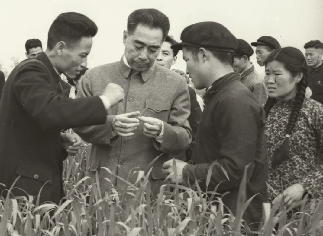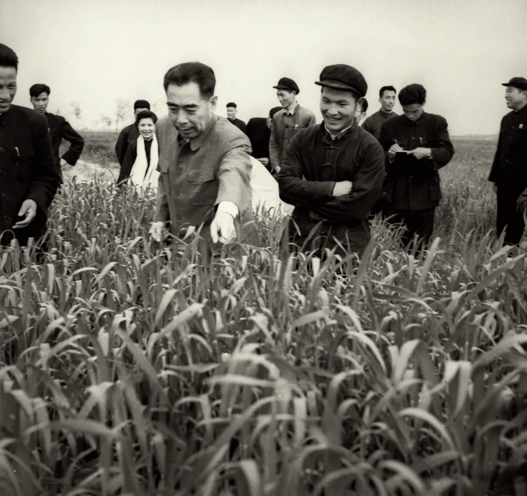 1958年4月,周恩来总理在郑州关虎屯麦田视察小麦生长情况照片来源《河南日报》1998年3月6日第5版 魏德忠 摄