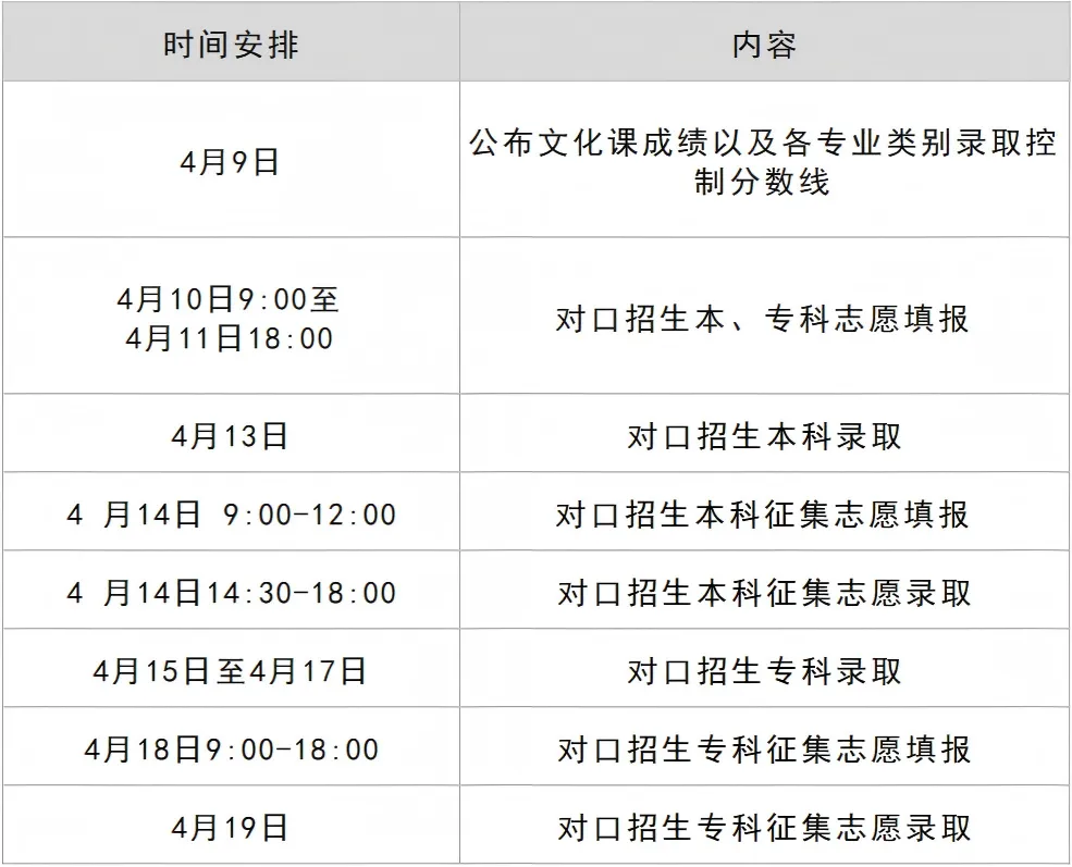 4月10日9:00至4月11日18:00,进行对口招生网上志愿填报。