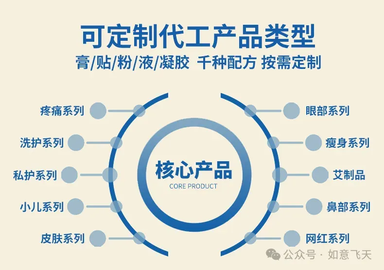 同时,郑州如意飞天重磅推出代工系列产品,包括疼痛系列、私护系列、皮肤系列、洗护系列、瘦身系列、眼部系列、鼻部系列等,如同一张细密的 “需求网”,覆盖从日常养护到细分场景、从全龄人群到专科需求的多元健康诉求。是对大健康外用品市场需求的深度拆解,更是代工硬实力的直观体现。