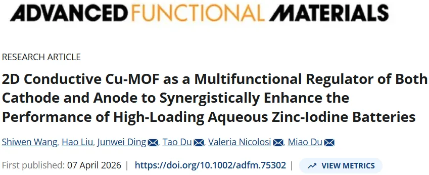本研究创新性地将一种具有独特Cu-O₄配位构型和高导电性的二维导电Cu-MOF(Cu₃(HHTP)₂)同时用作AZIBs的正极与负极多功能调节剂,实现了协同增强。