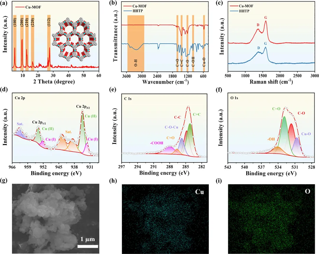 图1 结构与形貌表征。(a) Cu-MOF的XRD谱图。(b) HHTP和Cu-MOF的FTIR谱图。(c) HHTP和Cu-MOF的拉曼光谱。(d) Cu-MOF的Cu 2p、(e) C 1s和(f) O 1s XPS谱图。(g–i) Cu-MOF的SEM图像及相应的EDS元素分布图。