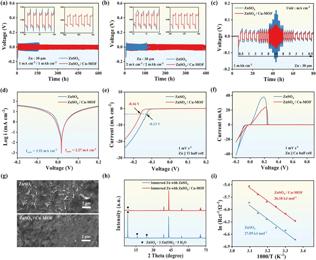 图3 在空白ZnSO₄和ZnSO₄/Cu-MOF电解液中Zn//Zn对称电池和Zn//Ti(Cu)半电池的电化学性能。(a) Zn//Zn对称电池在1mA cm⁻²/1mAh cm⁻²下的循环性能和(b)在2mA cm⁻²/2mAh cm⁻²下的循环性能。(c) Zn//Zn对称电池的倍率性能。(d) Zn//Zn对称电池的Tafel曲线。(e) Zn//Ti半电池的LSV曲线。(f) Zn//Cu半电池的CV曲线。(g) Zn//Zn对称电池中一个充放电循环后锌负极表面的SEM图像。(h) 在电解液中浸泡7天后的锌负极XRD谱图。(i) 水合Zn²⁺的活化能(Ea)。