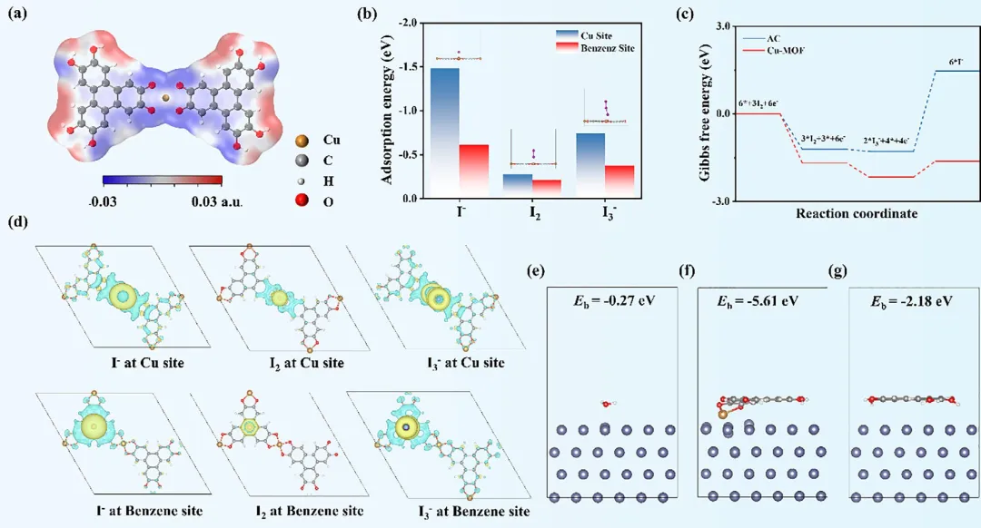 图4 Cu-MOF作为正极和负极多功能调节剂的结构与电子理解。(a) Cu-MOF的MESP分布计算。(b) Cu-MOF上不同吸附位点对不同碘物种的吸附能计算值。(c) 在活性炭(AC)和Cu-MOF上碘还原反应的吉布斯自由能谱图。(d) Cu-MOF上不同位点吸附不同碘物种时的电荷密度差图。(e,f,g) Zn(002)表面对(e)H₂O、(f)Cu-MOF和(g)HHTP分子的吸附能比较。
