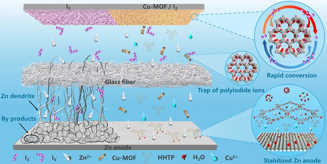 -促进转化动力学:Cu-MOF的高电子电导率为碘物种的氧化还原反应提供了高效的电子传输网络。同时,其多孔结构有利于电解质渗透和离子传输。二者协同作用,加速了I⁻/I⁰/I⁺之间复杂的多步转化反应动力学,提升了碘的利用率和反应可逆性。