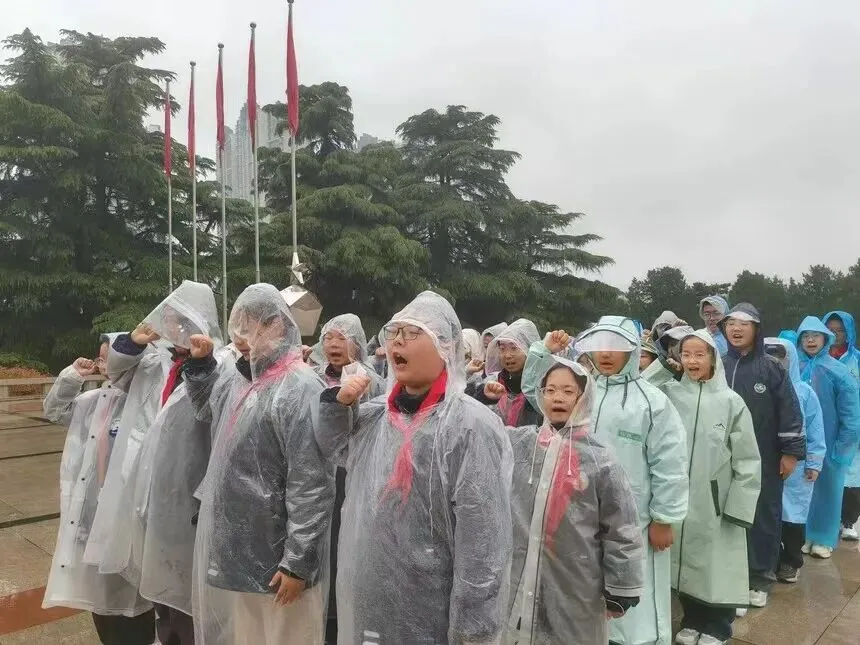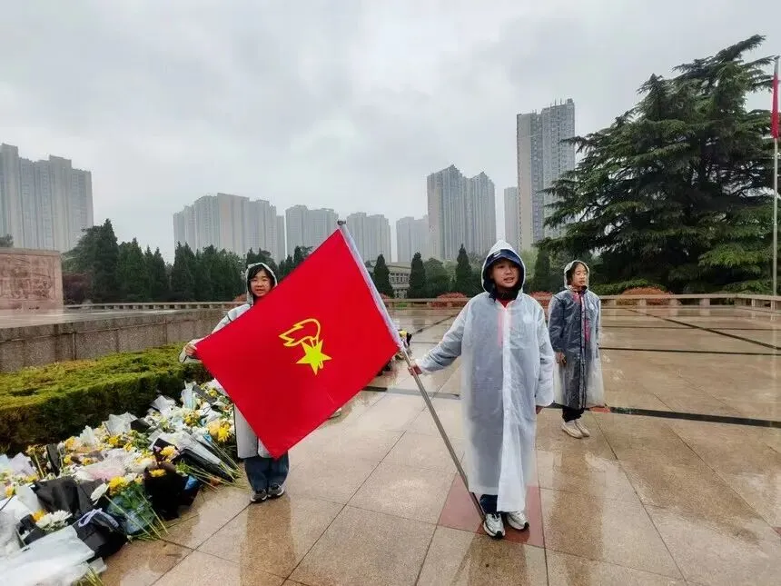 在郑州市烈士陵园,师生们冒雨举行祭扫仪式。活动特邀郑州市关工委“五老”报告团专家朱晓健现场讲述革命英烈故事,为同学们明晰新时代少年的责任与使命。在烈士纪念碑前,全体师生肃立默哀、行三鞠躬礼,少先队员庄严重温入队誓词,并向烈士墓敬献亲手制作的小白花,寄托对先烈的深切哀思。