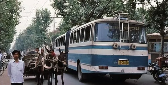 这一张我是真喜欢。蓝白色公交车在路中间,旁边是驴车,后面还有自行车。不同速度、不同工具、不同生活方式,全在一条路上碰头了。你说它乱吧,也有点;可你说它生动,那是真生动。