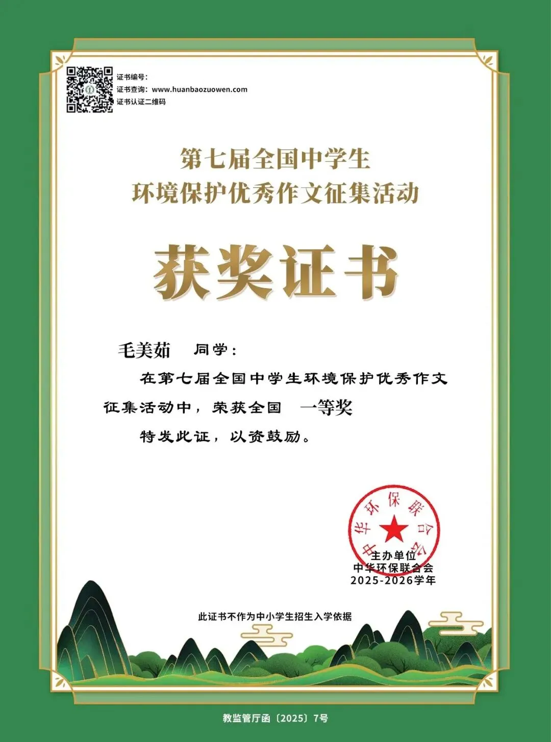 一直以来,郑州市第四十一高级中学始终重视环境教育与人文素养培育,鼓励学生关注社会、心系生态,用文字传递环保理念,以行动践行青春担当。此次大赛的优异表现,不仅为学校增添了荣誉,更激励全体四十一中人继续以笔为炬、以心护绿,在成长路上坚守生态初心,书写更精彩的青春篇章!