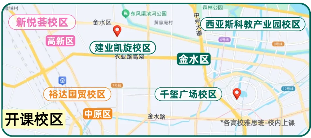 郑州新东方雅思的校区布局简直就是为大学生量身定制的。它们基本覆盖了郑州各大主城区,紧邻地铁站和大型商超,最夸张的是,校区竟然精准地分布在各大高校圈附近,真正做到了 “出校门即进班门” !