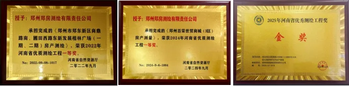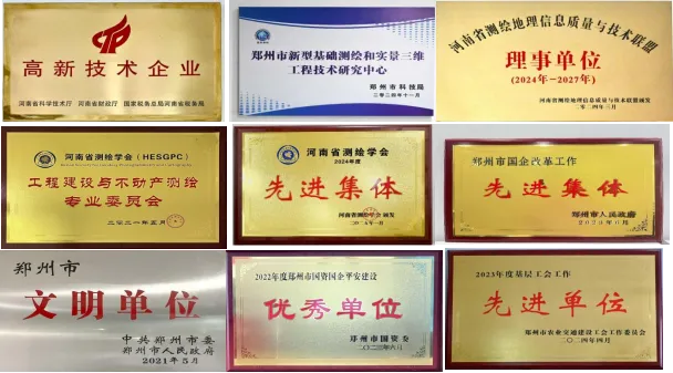公司获得中国测绘学会优秀测绘工程奖金奖,持续多年获得河南省优质测绘工程奖一等奖、二等奖、三等奖。
